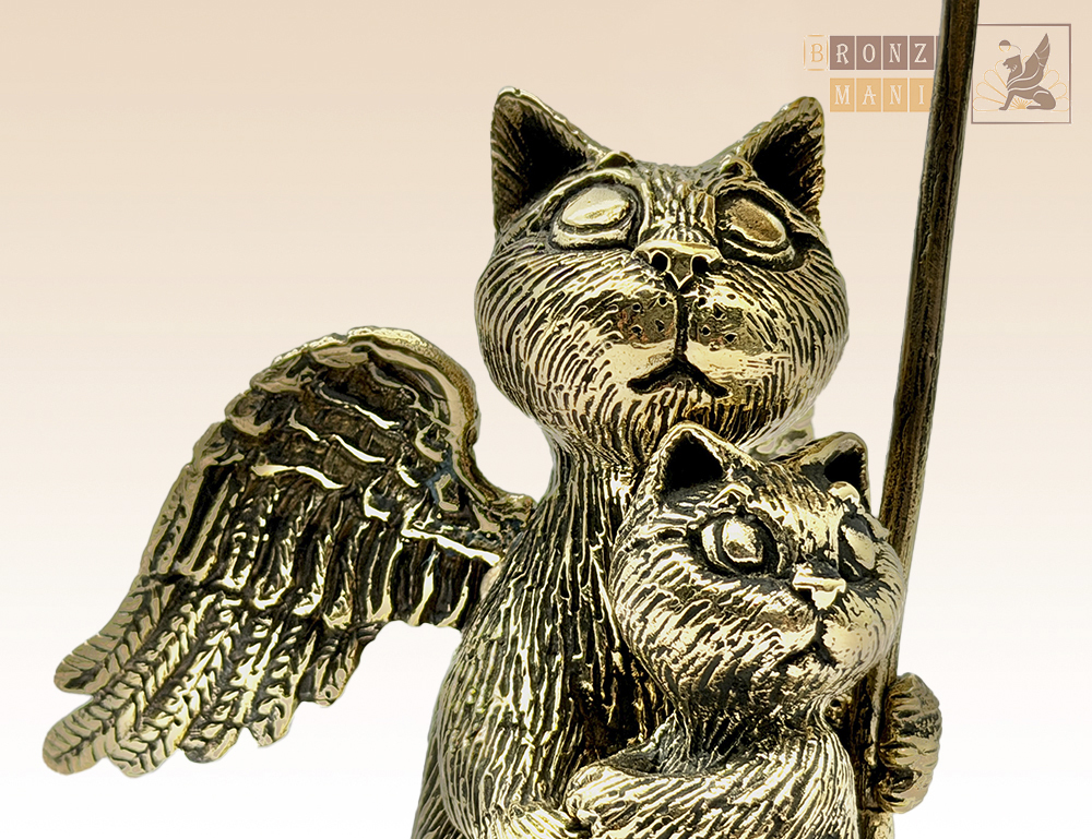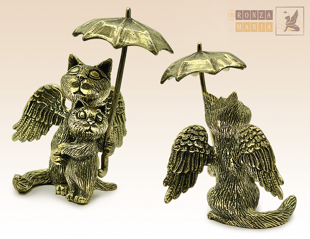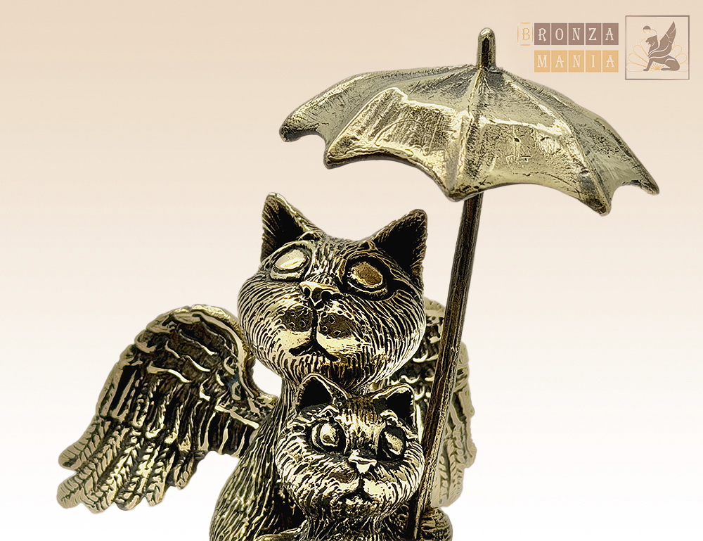 Изысканная статуэтка в виде бронзового кота с крыльями под зонтиком, который обнимает котенка, станет настоящим украшением вашего интерьера. Эта ручная работа воплощает в себе древнюю традицию создания оберегов и талисманов. Крылатый кот издавна считается хранителем домашнего очага и защитником от невзгод. Зонтик в его лапах символизирует надежную защиту от жизненных невзгод и неприятностей. Эта фигурка станет не только красивым элементом декора, но и мощным оберегом для вашего дома.