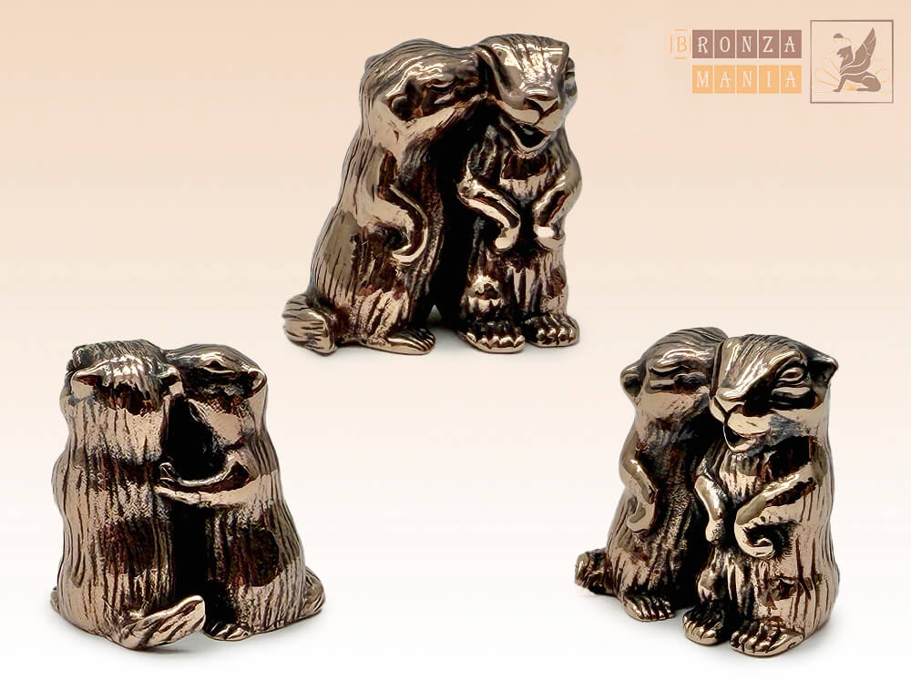Трогательная бронзовая фигурка двух сусликов, нежно прижавшихся друг к другу, — очаровательный элемент декора для дома или офиса. Привлечёт внимание своей выразительностью и добавит тепла в любое пространство.