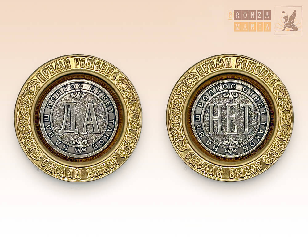 Красивая монета ДаНетка, оформленная в традиционном русском стиле и прикрепленная к подложке с текстом и магнитом – монета с решением. Надписи крупным шрифтом легко разобрать, по кругу размещен поясняющий текст. Оставшееся пространство заполняют сдержанные классические орнаменты.