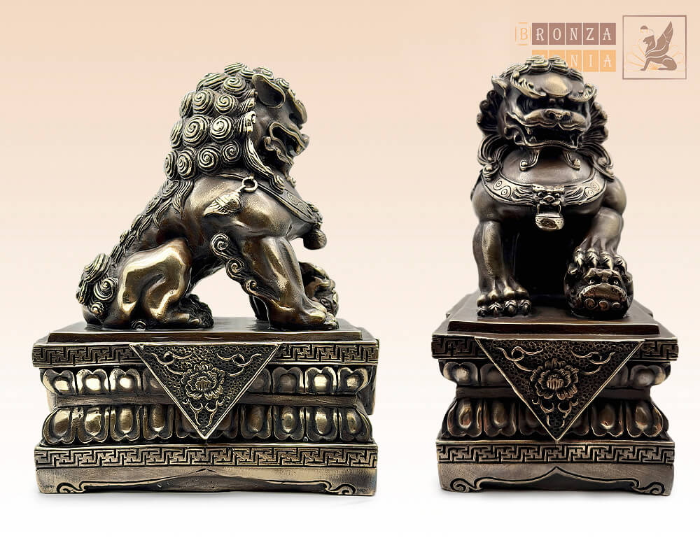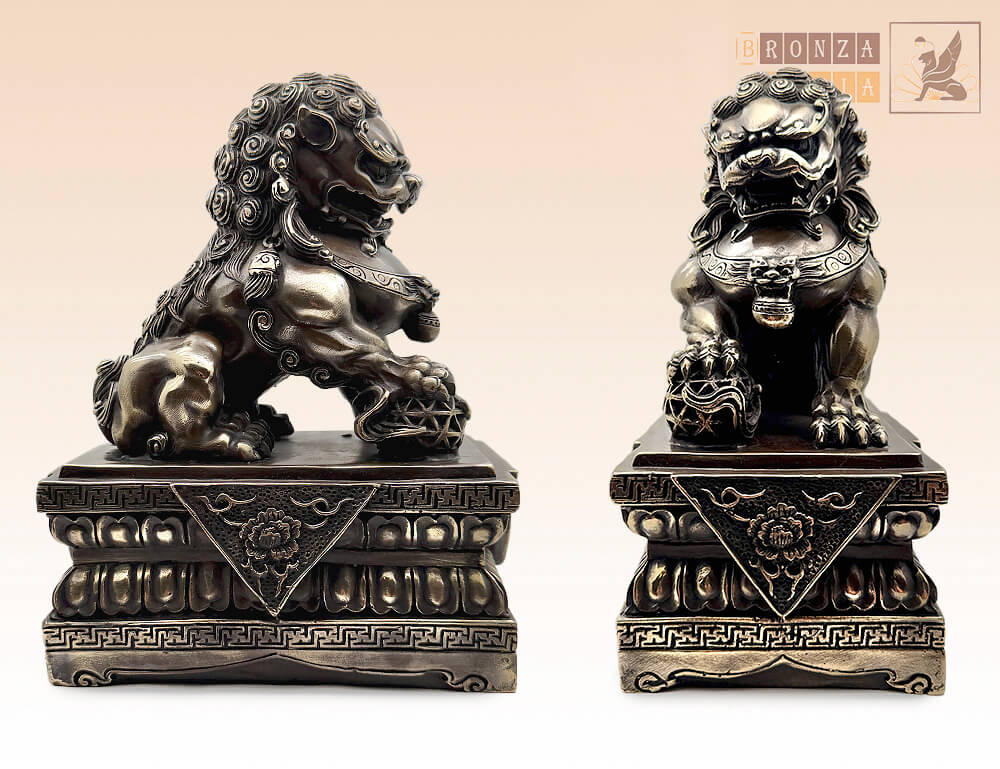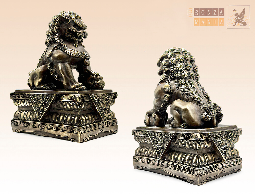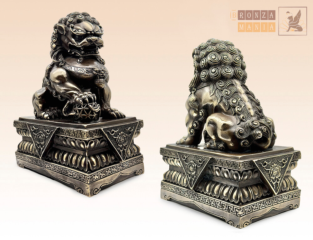 Величественные львы созданы стоять на страже. Согласно китайской мудрости фигуры животных необходимо ставить парами (лев и львица), так они более надежно стерегут храм или, в случае фигурок, ваше жилище. По правую стороне обычно располагается лев, придерживающий лапой шар, который в буддизме трактуется как—сокровище, символ буддийского знания, способный исполнять искренние желания и несущие просветление. По левой стороне находится - львица, которая придерживает лапой львёнка. В случае парных скульптур, пасть одной как правило приоткрыта, другая же наоборот. Скульптуры были созданы по приказу генерала Чана и установили охранять кумирню. После его кончины фигуры подарили в Россию, а в последствии переданы в Санкт-Петербург. С тех пор львы бережно стерегут набережную и выход к реке. Прекрасные фигурки станут настоящими хранителями вашего дома. Они гармонично впишутся и дополнят ваше убранство комнаты. Оформить заказ можно как на одну (25000 руб.), так и сразу на пару фигур (50000 руб.)